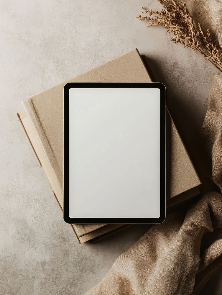 Tablet mockup with white screen books minimalist beige.